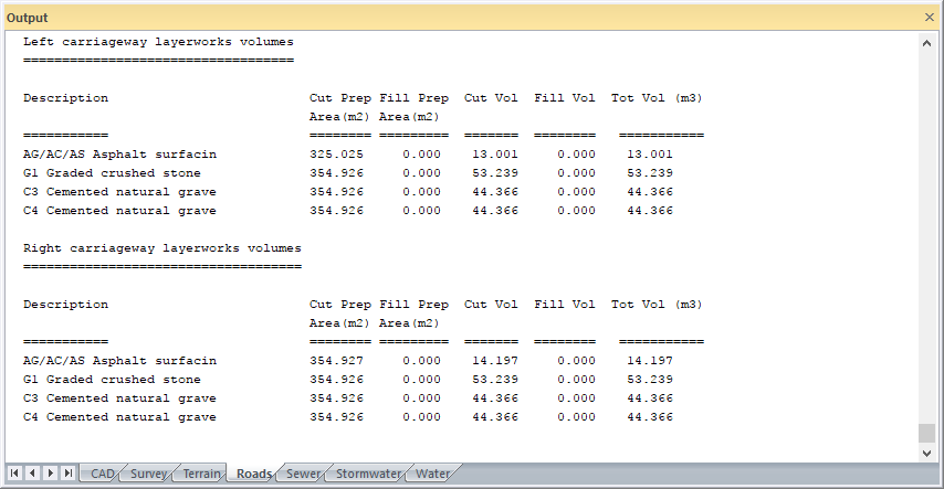 This function allows you to calculate the volumes of layerworks that have been included in the template(s) applied to the active road.