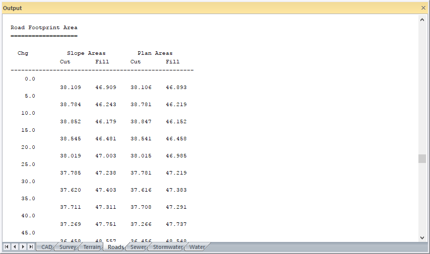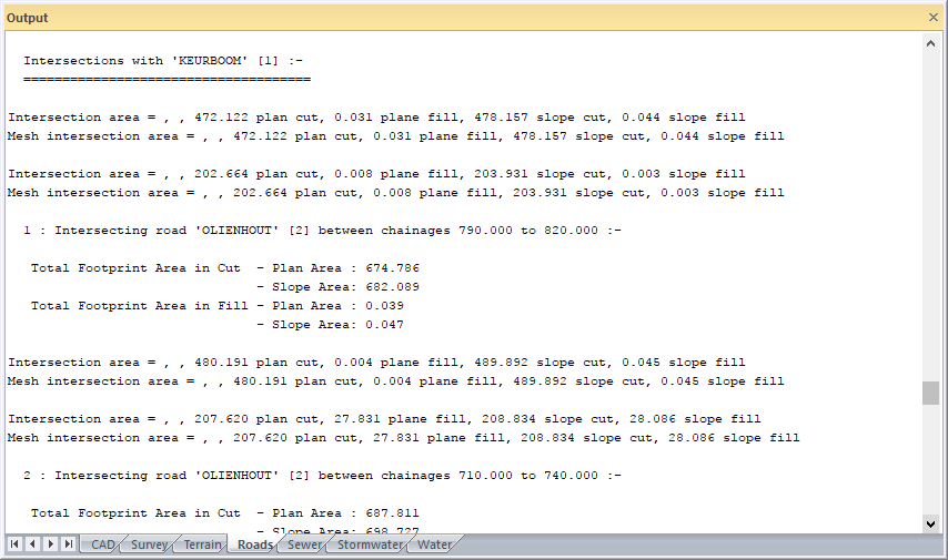 This function allows you to calculate the plan and sloped areas in cut and fill, for the road footprint.