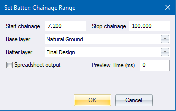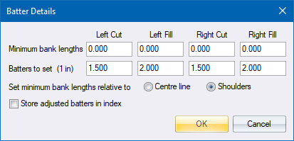 The slopes, left and right, cut and fill, are expressed as 1:nn; so '0' gives a vertical slope and '999' gives a flat one. The batters can be forced to a minimum width left and right in cut and fill. This is an absolute figure relative to the centre line, for example "23'' gives toe points at 23m for that item unless the earthworks naturally extend beyond this; or a set distance from the shoulder break point. An entry of 0 allows the banks to behave normally.