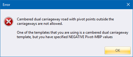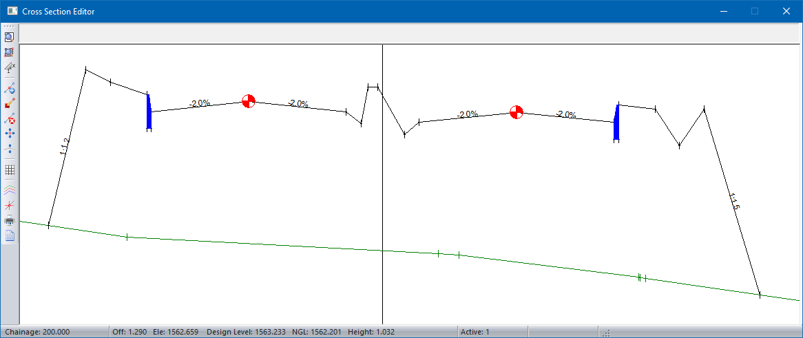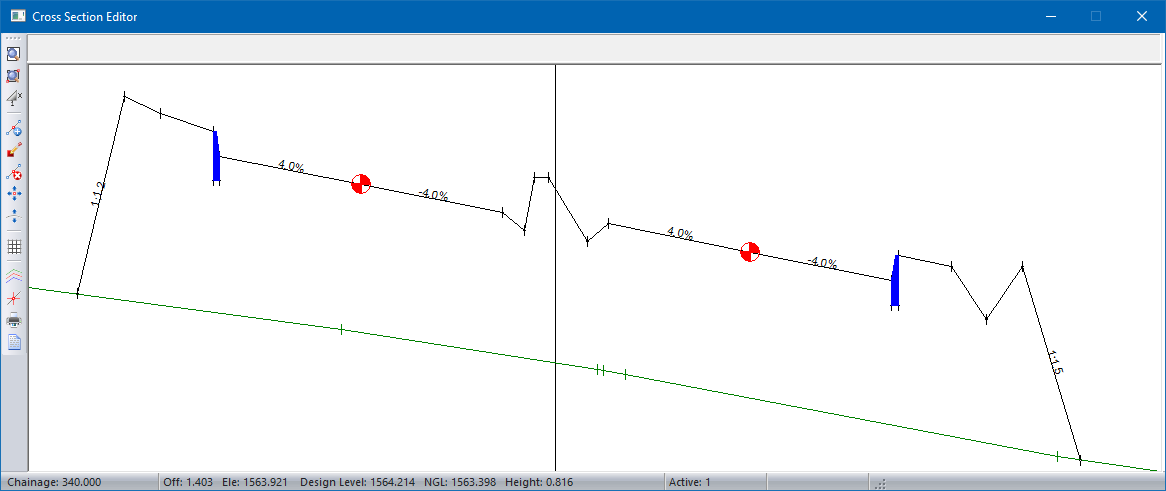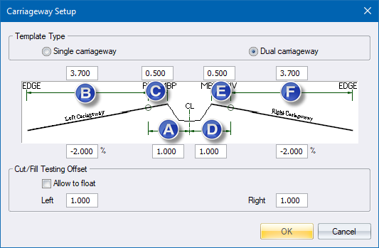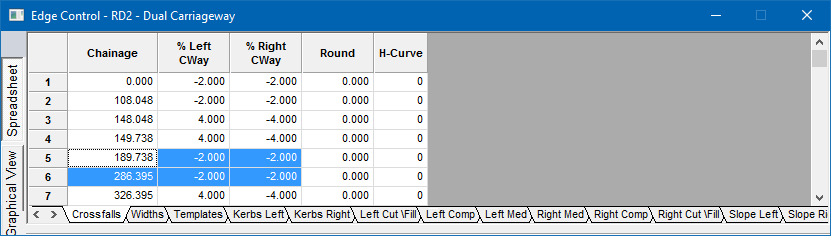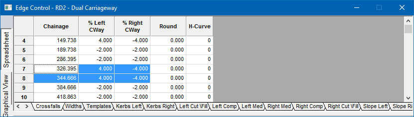 The edge control input is exactly the same as a standard non-crowned road. There is still only one horizontal alignment for dual carriageways, and the super elevation is also specified by one value for the left and one value for the right hand side. For crowned dual carriageways, this means that the left super value in the edge control is applied to both carriageways – left of the two crowns.