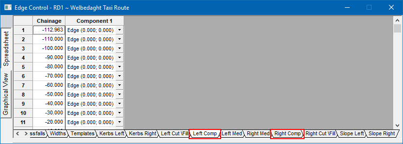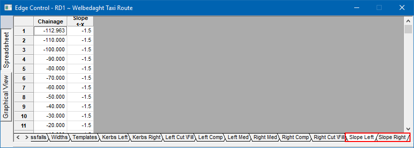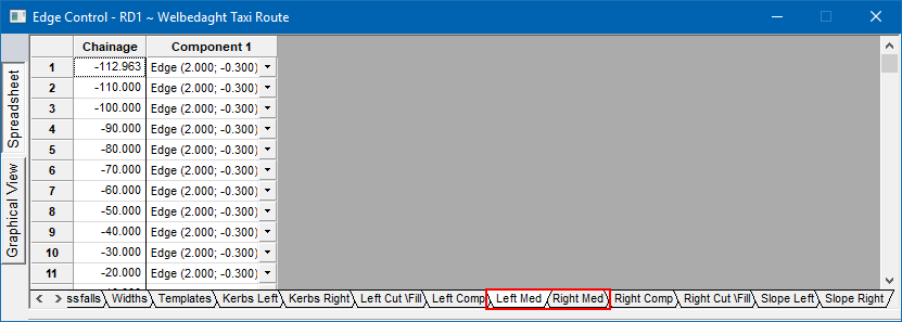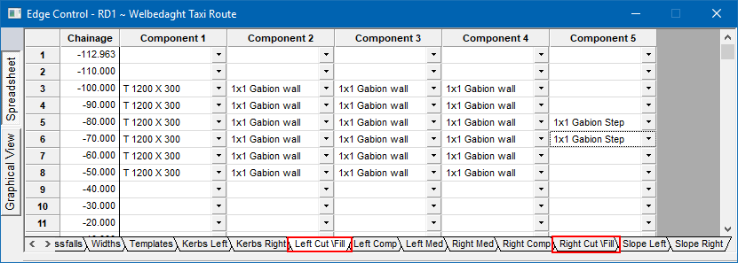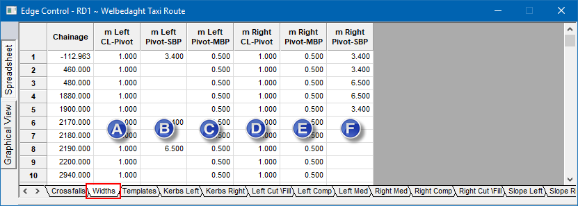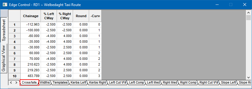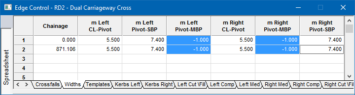 The Edge Control spreadsheet allows you to control the road cross-section in detail, with the following items: