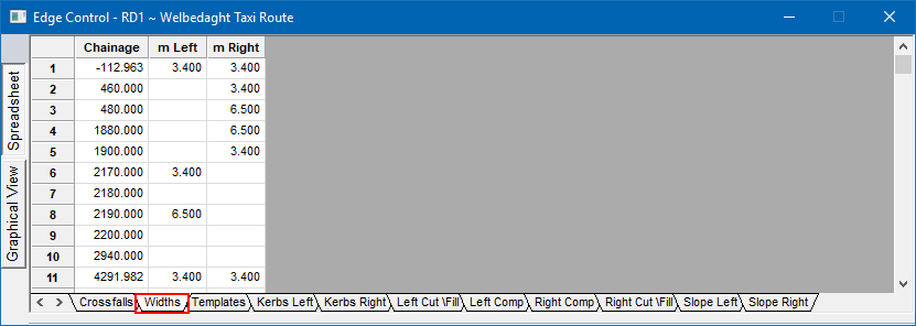 If any of the values in the spreadsheet (except Chainage) are left blank, they will automatically be linearly interpolated using the nearest valid data. This means that you only have to enter data where the lane width or pivot point actually changes.