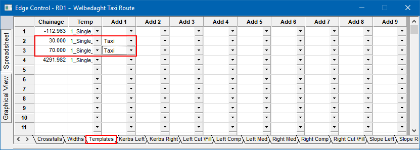 The Templates tab allows you to vary the template over the length of the road. It also allows you to add an additional template to the outer edges of the road profile. When running Apply Template, the templates specified in the Temp column of the Templates page will be Applied while the templates in the subsequent columns (Add1, Add2) will be Added. The only compulsory entries in the templates page is the Chainage and Temp column.