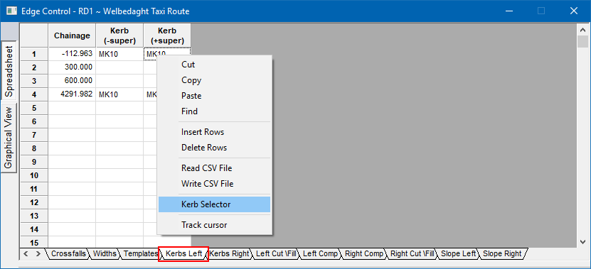 To specify a kerb, right-click on Kerb cells and select the Kerb Selector option from the popup menu.