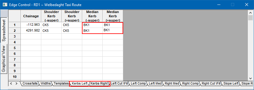 The kerbs tabs allow you to specify kerbs on the edges of the carriageway. You can specify different kerbs for negative and positive crossfall slopes in the (-super) and (+super) columns.
