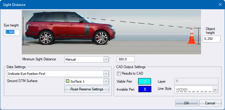 If Design Criteria Dialog is enabled, select the Sigh Distance Type to be used. The values for Eye height and offset, object height and offset as well as the minimum sight distance will be read from the Design Criteria. Alternatively, select “Manual” to specify custom values. |