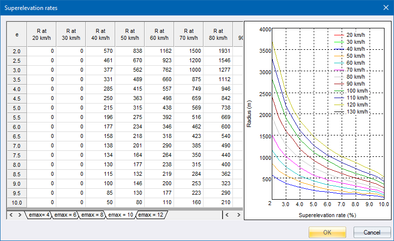 Enter the radii for each design speed next to the appropriate super elevation rate (e) in percentage. When changing any of the values, the graph is updated instantaneously.