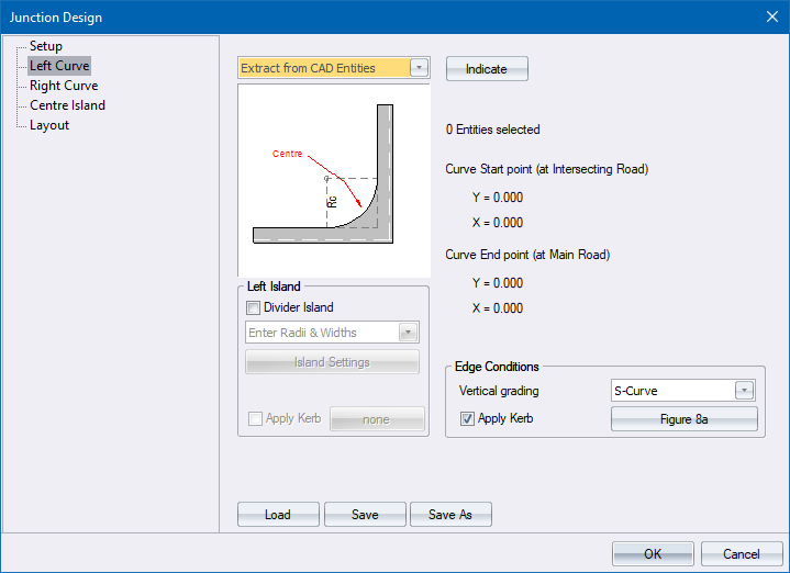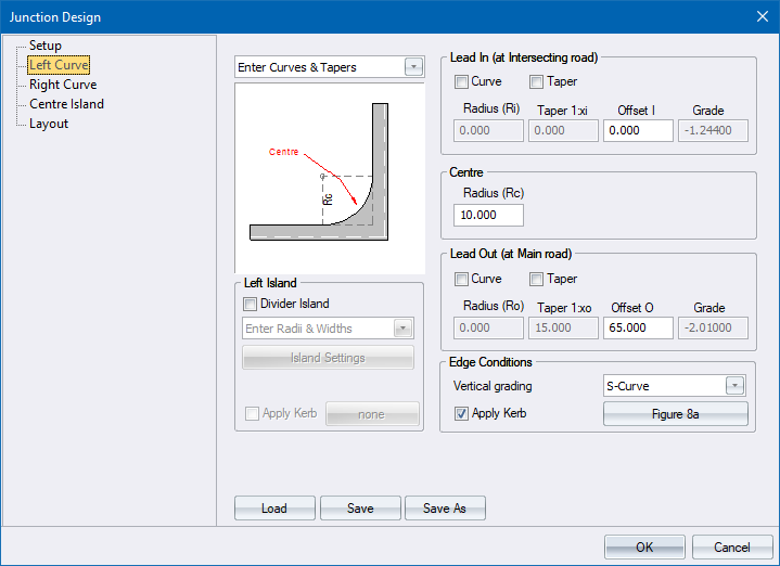 Enter Curves & Tapers - Specify the edge details of the intersection. Data requirements are the same for both left and right curves.
