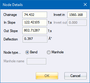 When editing any of the Chainage, Invert In, Invert Out, In Slope or Out Slope values, the other values will automatically be calculated when you scroll off the edited edit-box (press [Tab]), or when press [OK]. If you edit the In Slope, the Invert In value will be updated.