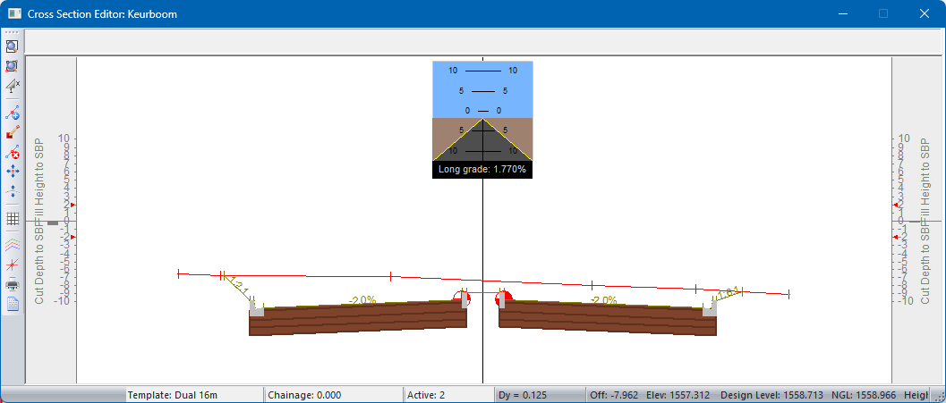 The Cross-Section Editor allows you to view and edit individual cross-sections. These changes are then saved and re-applied if the road has to be recalculated due to subsequent alignment changes. The changes will only be overridden when the designer physically runs the Apply Template function again.