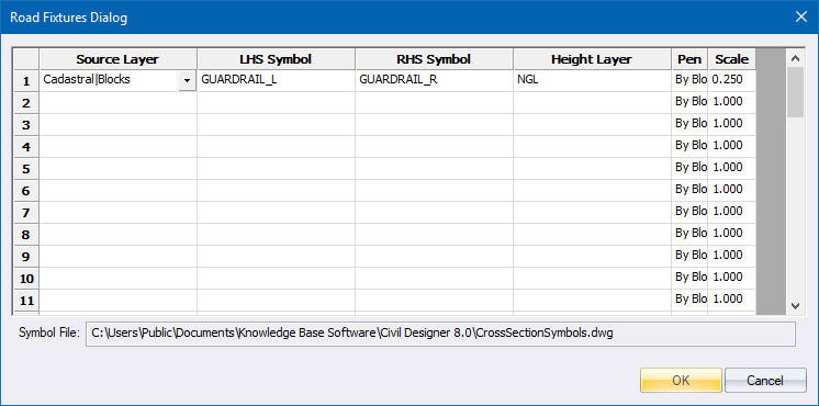 Specify the CAD layer to use to determine the position of the road fixture. Where the cross-section crosses a line or polyline in the specified layer, the selected symbol will be displayed on the cross-section. |
