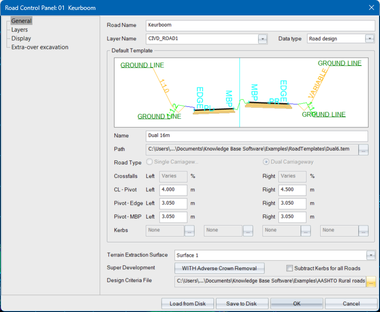 Specify the distance between the pivot point and the outside edge of the left and right carriageways. These may be changed using the Edge Level Editor.