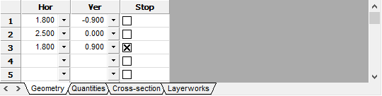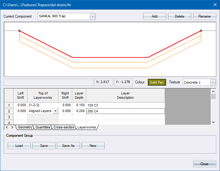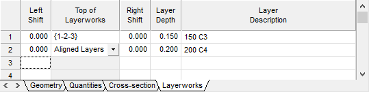 This section defines the layerworks for the component. Entries consist of the left and right optional shifts from the component limits in order to create a stepped layer, the depth of the layer and a description of the layer.