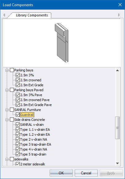 Select one or more components from the component library list. This makes the components available in the Template Editor, Edge Level Spreadsheet and the Component Panel of the Cross-Section Editor.