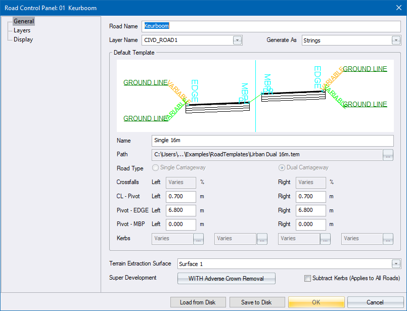 The Control Panel button on the Road Selection window allows you to enter a new description for your road, as well as setting the names of the various layers. The description of the current road is displayed on the Design Centre Title Bar, and on the Road window Title Bar when any of the roads routines that use that window are activated.