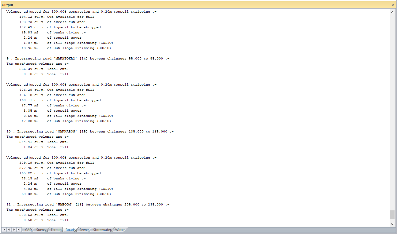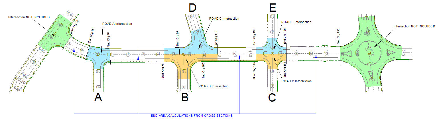 Masshaul/Cumulative Volumes, Road Footprint Area and Layerwork volumes calculations are done using the end-area method from the cross-sections (as per the cross-section method) for the current road, for portions of the road where there are no incoming junctions. The portions of the current road where there are incoming junctions are omitted from the end area calculations.