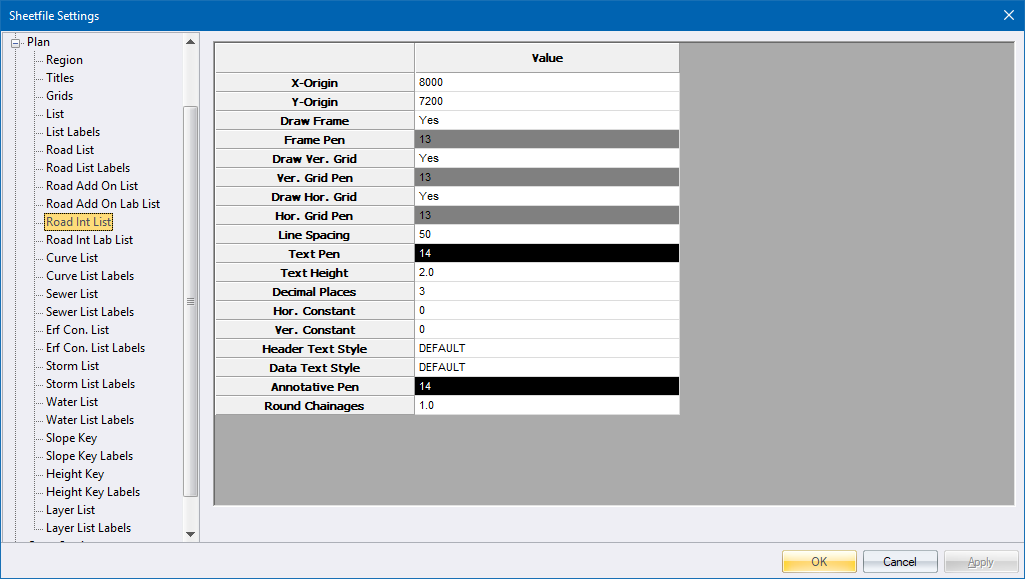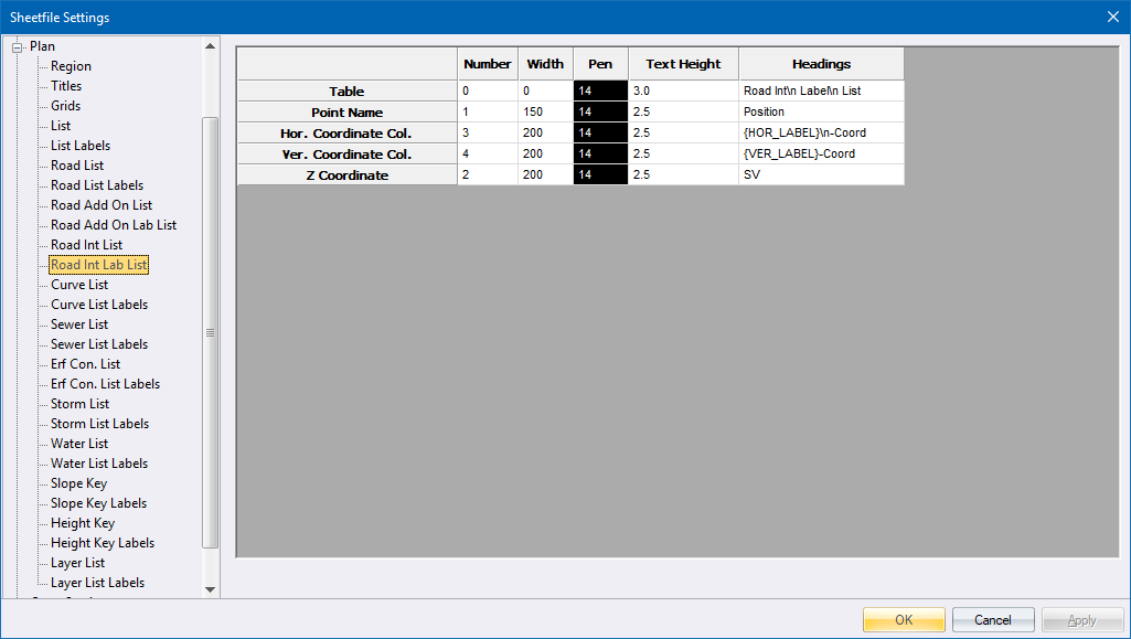 The Road Int List specifies the plotting parameters of the junction coordinate table layout.