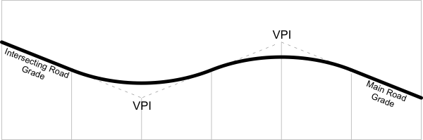 Vertical coordinates (elevations) are generated by means of two vertical curves. First, the overall distance is divided into six parts. The first sixth and the last sixth are straights that conform to the grades of the intersecting road edges. In the remaining space, two equal and butting vertical curves are fitted. Therefore, the two VPIs are at one third and two thirds of the way along the overall coordinated stretch, as shown above.