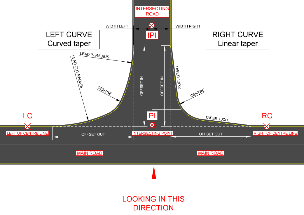 The junction edge string runs from the main (through) road edge, along the lead in taper/curve, the junction edge curve and finally along the lead out taper/curve, to tie in to the intersecting road's edge.
