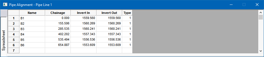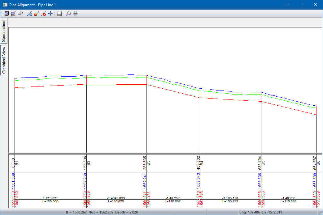 The long section can now be edited using the graphical functions, or by editing the data in the spreadsheet.