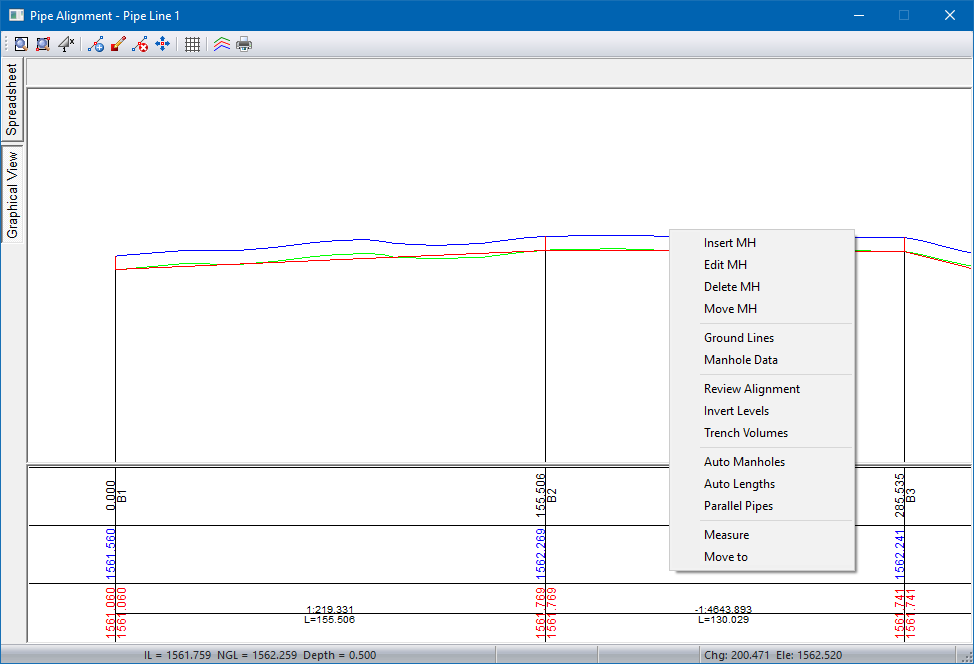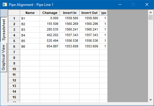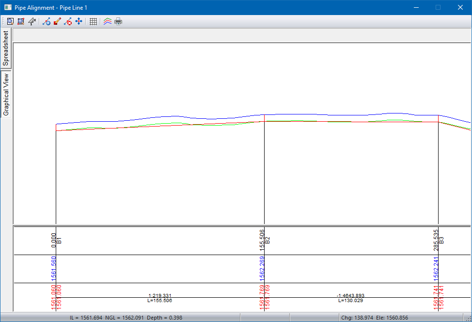 You can also edit the vertical alignment of the pipe using the Graphical tab. This displays the pipe line as a long section.