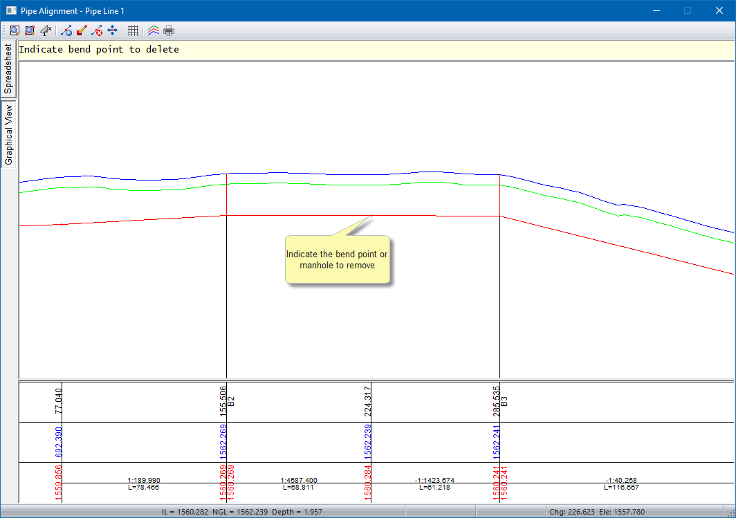 This function allows you to graphically delete a manhole or bend point in the pipe long section.