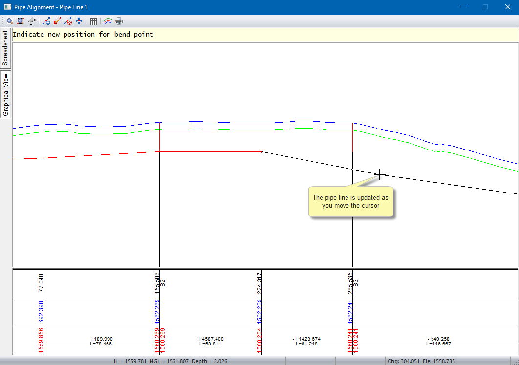 You will be defining both the new chainage and invert level of the manhole/bend point. The Status Bar shows the cursor chainage/elevation as you move it.