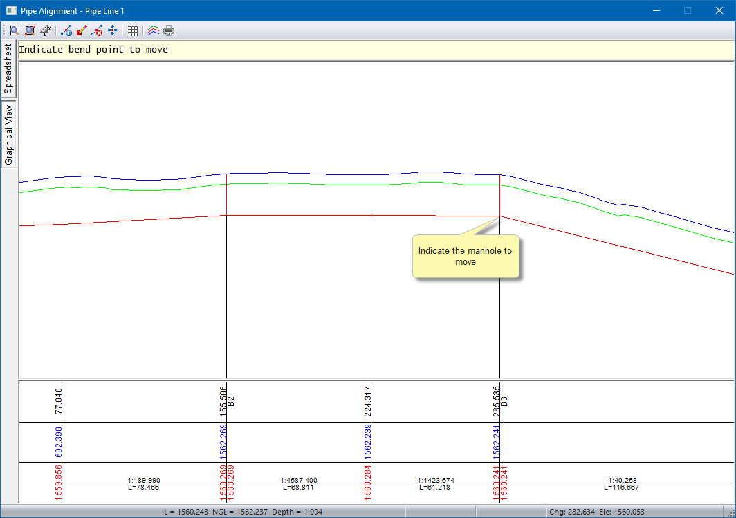 Click on a manhole or bend point that you want to move. The long section updates as you move the cursor.