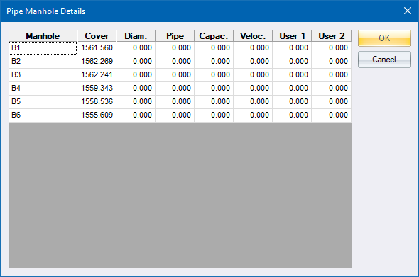 Edit data for the manholes in the pipe alignment.