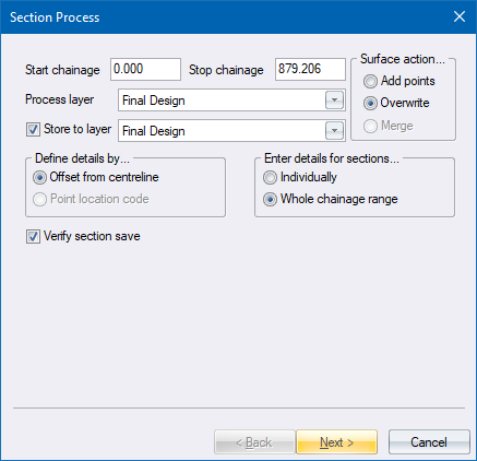 If you selected the Individually option for Enter details for sections in the Process Details, the Expand/Shrink settings display for each chainage in the range, giving you the opportunity to alter the specified details for each chainage.