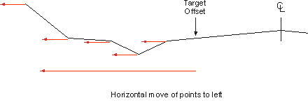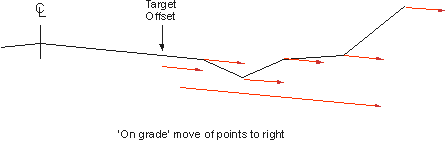 A 'target offset' is identified, from which the movement is based. This is an offset relative to the CL. The points lying either to the left or to the right of this 'target offset' can be moved horizontally, or along the grade of the section at the 'target offset'.