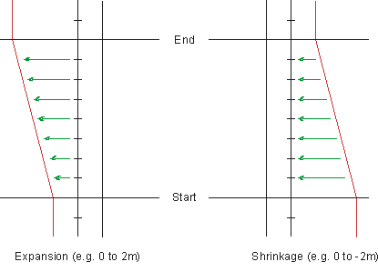 If the details are to be applied to the entire specified chainage range, you must enter the amount to insert at both the start and stop chainages. The actual value can either be an expansion (positive value) or shrinkage (negative value), or nothing. For each intervening section, the amount to insert is calculated by lineal interpolation between the start and stop chainages.