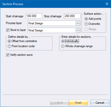 If you selected the Individually option for Enter details for sections in the Section Process, the Elevation Interpolation options display for each chainage in the range, giving you the opportunity to alter the specified offset for each chainage.