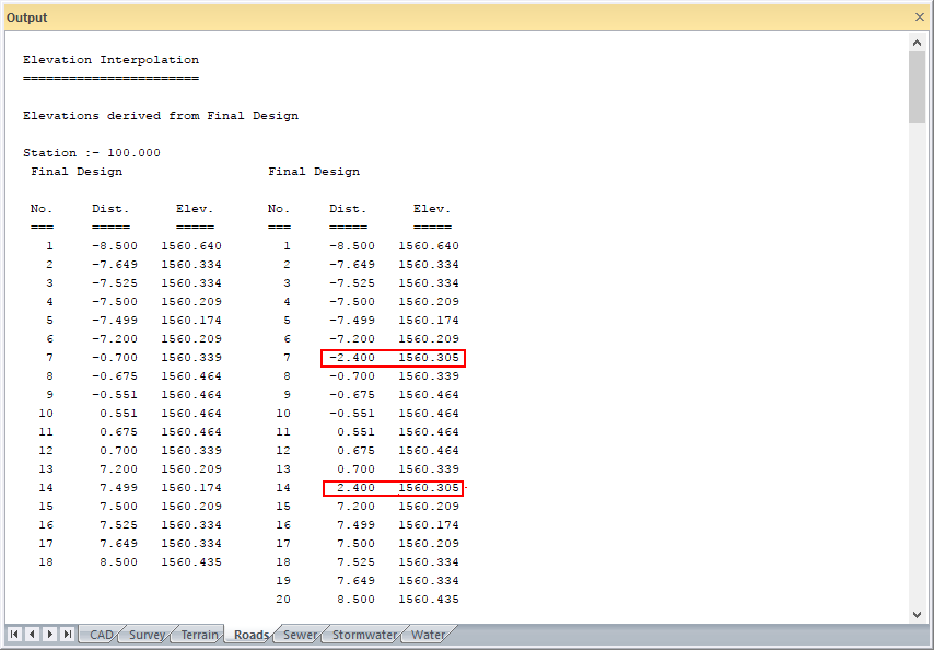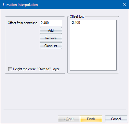 The program interpolates elevations for each of the offsets present in the Offset List. If the Offset List is empty, the program interpolates a height for the offset entered into the Offset from centreline edit box.