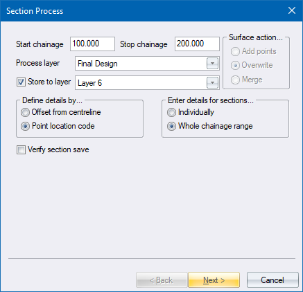If you selected the Individually option for Enter details for sections in the Process Details, the Layer Deduction settings display for each chainage in the range, giving you the opportunity to alter the specified offset for each chainage.