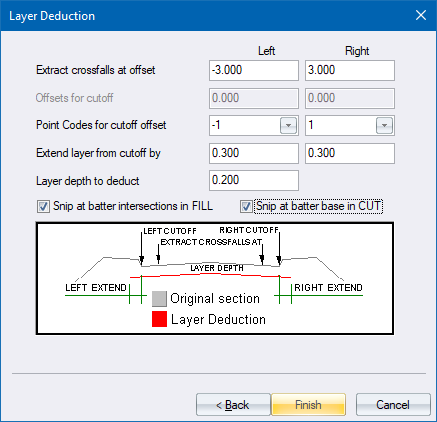 The Offset for Cut Off dictates how far the layer runs. It may be an offset or a PLC code, and the layer extends this far unless either of the Snip at Intersection or Cut/Fill checkboxes are checked. If they are, the layer stops short of the Cut-Off offset if it crosses a cut or fill batter slope.