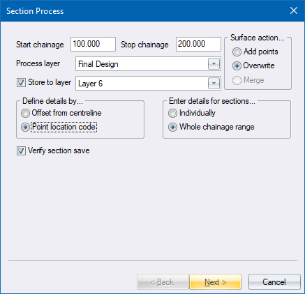 This function allows you to create simple earthwork cross-sections from an existing final road layer, by deducting a layer of a certain depth between specified offsets. In a cut situation, this layer normally has vertical sides resulting in an earthwork 'box'.