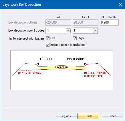 The depth of the box to deduct must be entered, as well as specifying whether the base of the box should attempt to intersect with the left and/or right batters of the section. There is an option to either ignore or add the points beyond the limits of the created box. Ignoring the points yields a section that is confined to the box bottom and walls alone, and is the most common choice if only a visual representation or plot of the section is required. Adding the points results in all the data beyond the box limits being included in the new section. This includes the batters, if present. This option would be used if areas and volumes were required from the resulting cross-section.