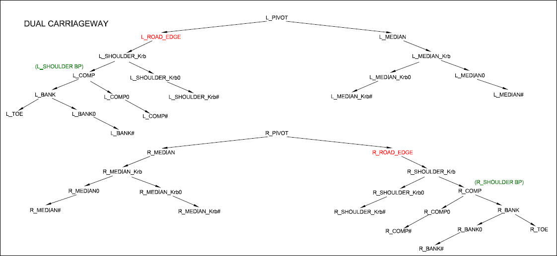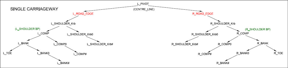 The L_PIVOT string contains the vertical alignment string along the left pivot for the left carriageway. The R_PIVOT string contains the vertical alignment string along the right pivot for the right carriageway.
