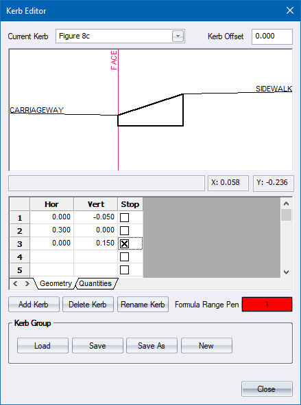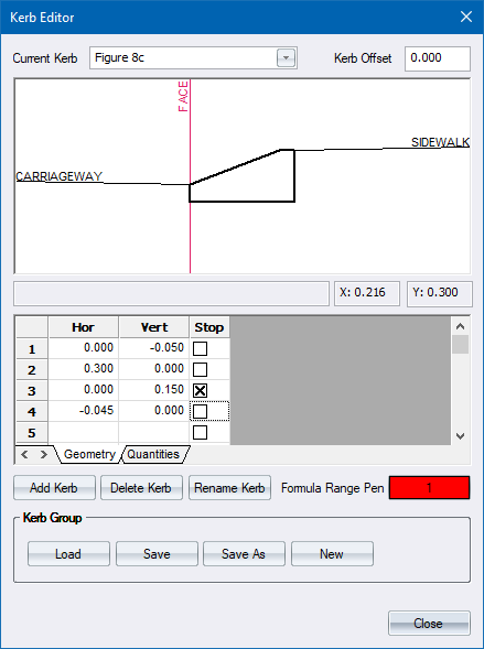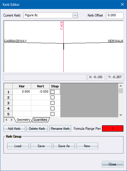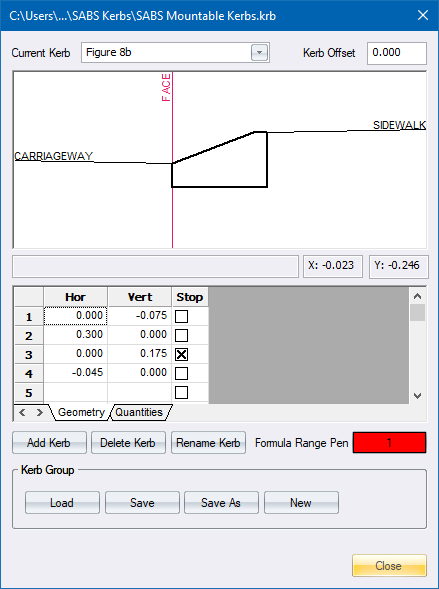 Define the kerb geometry in terms or horizontal and vertical offsets. Start at the edge of the carriageway and define the geometry as follows for this example.