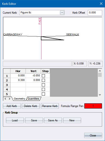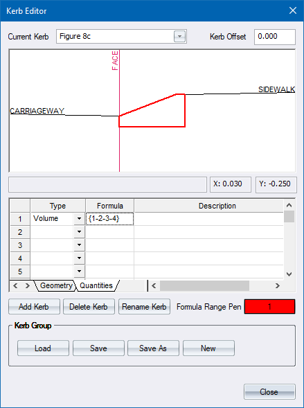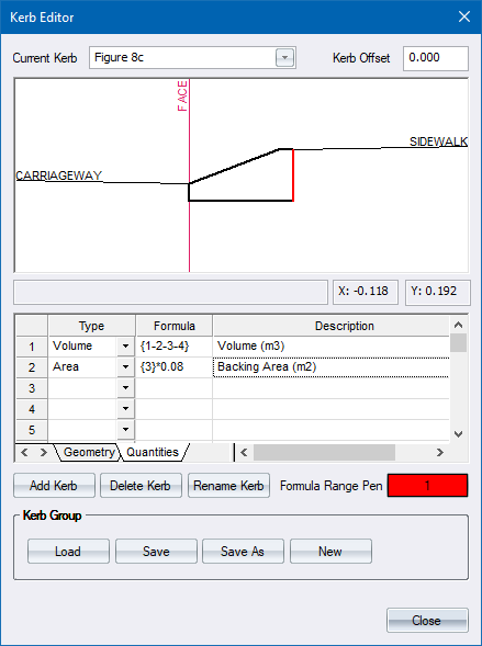 A kerb group file contains one or more kerbs. Each kerb contains cross-sectional geometry data and quantities data. The kerbs can then be specified in the Edge Levels specifications, which are then stored as part of the Batter layer after running Generate Levels. You can then calculate kerb quantities and plot cross-sections that include the kerbs.