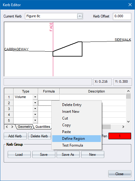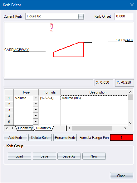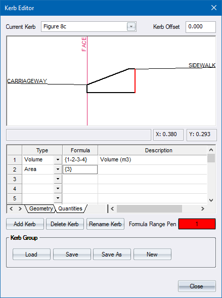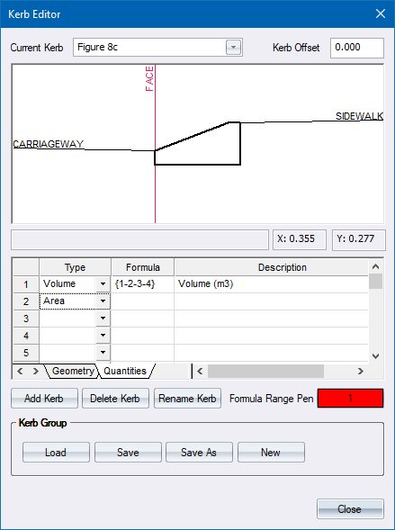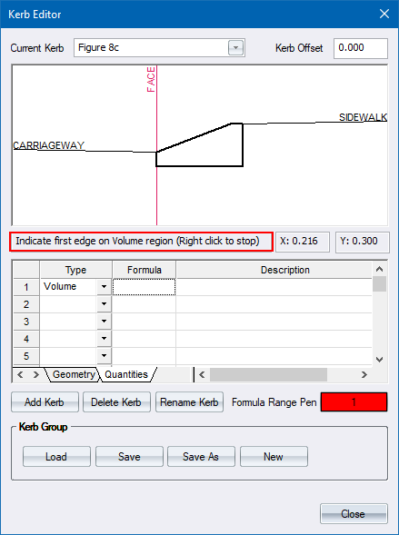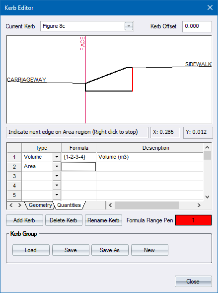 The first quantity you need is the kerb volume. This is defined by specifying the type as Volume, and then adding the corner points of the kerb cross-section.