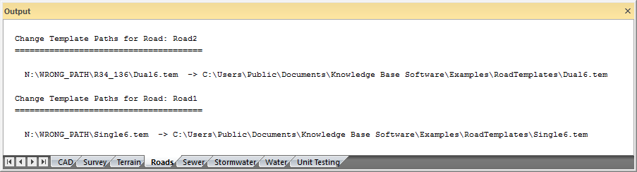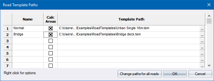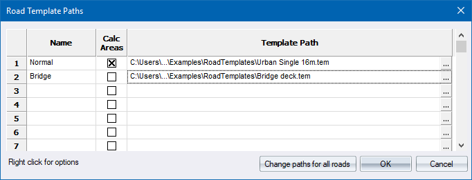 You can change the template paths of all the roads in a project. Civil Designer goes through all the existing template paths and update them to refer to the new location if the new folder contains the template specified by the original entry. For example, if the Road Template Paths dialog refers to a file called Single6.tem and you specify a new path, the path will be changed if the Single6.tem file exists in the new location. If it does not exist in the new location, the path entry will remain unchanged and it will be indicated in the Output window.