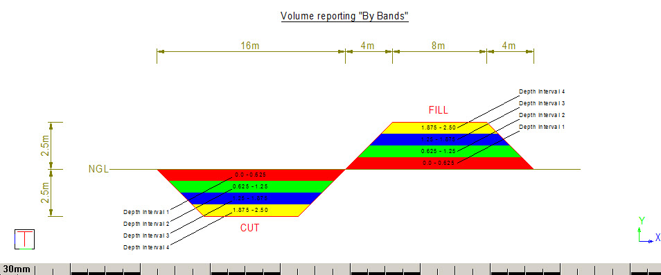 The Band method of calculation subdivides the calculated volume for a particular depth into the various depth bands consisting of the actual cut or fill depth AND all the preceding bands. This is in accordance with the SABS 1200 method of volume calculation.
