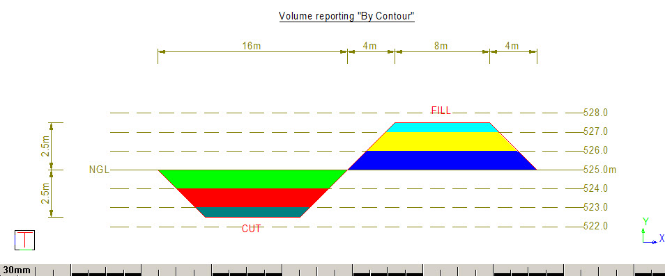The Contour calculation method assigns the entire calculated volume between two consecutive contours to the contour band of the actual cut or fill depth.