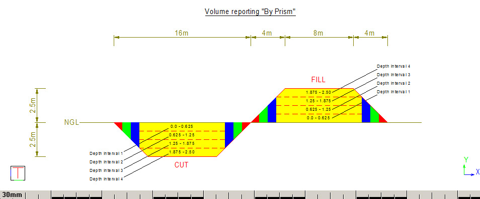 The Prism method of calculation assigns the entire calculated volume for a particular depth to the depth band of the actual cut or fill depth.