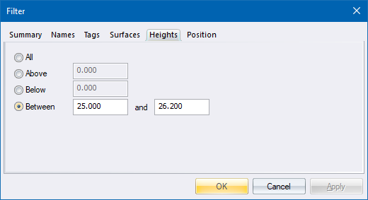 Select this option, and enter values alongside it, to have all points between a range, inclusive, to pass. The values can be the same to specify a single height. e.g. Entering values for between 0.0 and 0.0 will allow you to process only zero heighted points, useful for say batch deleting points that don't contribute to the ground model. |
