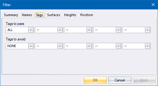Enter up to five tags that should pass the filter. The standard entry of ALL (in uppercase) will pass all points. Blank entries are indicated by two consecutive hyphens i.e. --. |