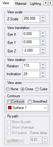 Select the AVI output option to have the successive view frames written out as an AVI file for subsequent replay. The created file has the same name as the terrain file with an '.avi' extension. |