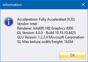 Above are examples of the type of information displayed after clicking Info. Details will change depending on the presence and use of 3D accelerator cards capable of accelerating OpenGL.